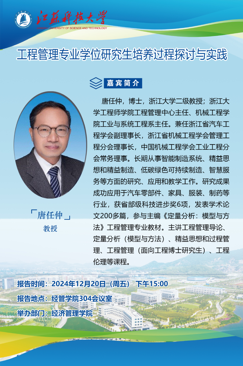 报告人简介:唐任仲,博士,浙江大学二级教授;浙江大学工程师学院工程管理中心主任、机械工程学院工业与系统工程系主任。兼任浙江省汽车工程学会副理事长,浙江省机械工程学会管理工程分会理事长,中国机械工程学会工业工程分会常务理事。长期从事智能制造系统、精益思想和精益制造、低碳绿色可持续制造、智慧服务等方面的研究、应用和教学工作。研究成果成功应用于汽车零部件、家具、服装、制药等行业,获省部级科技进步奖6项,发表学术论文200多篇,参与主编《定量分析:模型与方法》工程管理专业教材。主讲工程管理导论、定量分析(模型与方法)、精益思想和过程管理、工程管理(面向工程博士研究生)、工程伦理等课程。