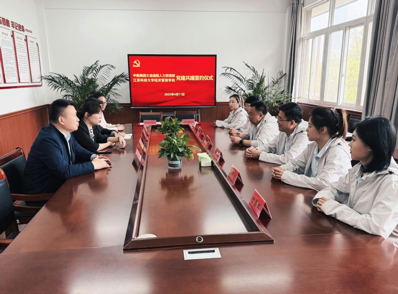4月11日,经管学院与中船集团大连造船人力资源部/组织人事部举行党建共建签约仪式。大连造船党委委员、人力资源部/组织人事部部长曾嵘、副部长张人民、经管学院党委书记尹洁、团委书记周庆文、教育培训中心主任曹献飞及双方工作人员出席活动。