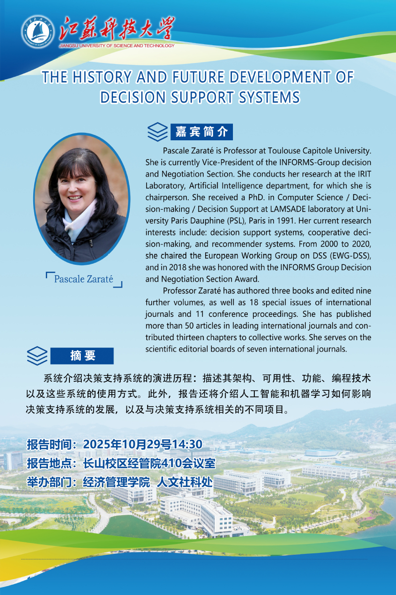 报告人简介:Pascale Zaraté is Professor at Toulouse Capitole University. She is currently Vice-President of the INFORMS-Group decision and Negotiation Section. She conducts her research at the IRIT Laboratory, Artificial Intelligence department, for which she is chairperson. She received a PhD. in Computer Science / Decision-making / Decision Support at LAMSADE laboratory at University Paris Dauphine (PSL), Paris in 1991. Her current research interests include: decision support systems, cooperative decision-making, and recommender systems. From 2000 to 2020, she chaired the European Working Group on DSS (EWG-DSS), and in 2018 she was honored with the INFORMS Group Decision and Negotiation Section Award. Professor Zaraté has authored three books and edited nine further volumes, as well as 18 special issues of international journals and 11 conference proceedings. She has published more than 50 articles in leading international journals and contributed thirteen chapters to collective works. She serves on the scientific editorial boards of seven international journals.
