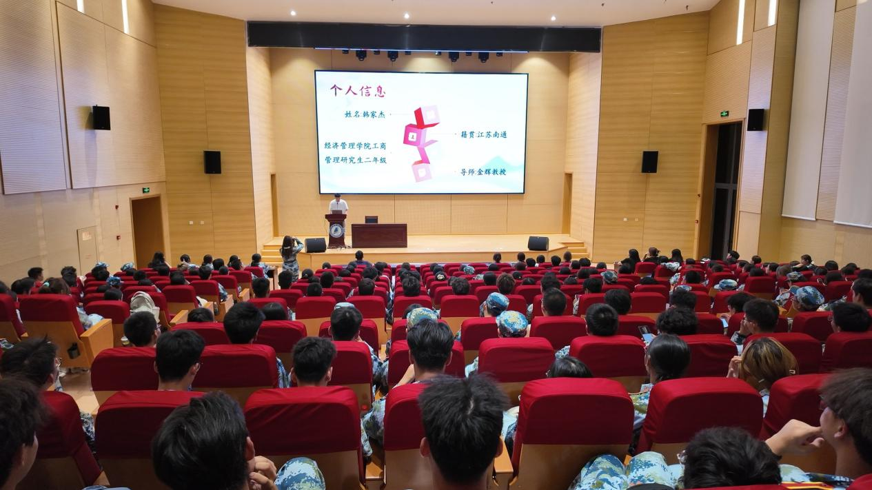同日,一场别开生面的朋辈分享会点燃了新生们的奋斗激情。学院研究生韩家杰以“从苦难历史到伟大复兴”为主线,结合自身特殊经历与新生们深情交流。作为曾参加庆祝中华人民共和国成立70周年阅兵式火箭军徒步方队的一员,他通过珍贵的训练与受阅图片,分享了在烈日下锤炼意志、在国旗下践行使命的心路历程,生动诠释了“军人本色”与“青年担当”。围绕九一八事变的历史警示,韩家杰勉励全体新生:“个人理想需融入国家发展,经管学子既要钻研专业知识,更要厚植家国情怀,将‘经管’专业特色与‘强国’时代使命紧密相连,在新征程中书写青春华章。”真挚的分享、鲜活的榜样,让新生们深受鼓舞,进一步坚定了“听党话、跟党走”的信念。