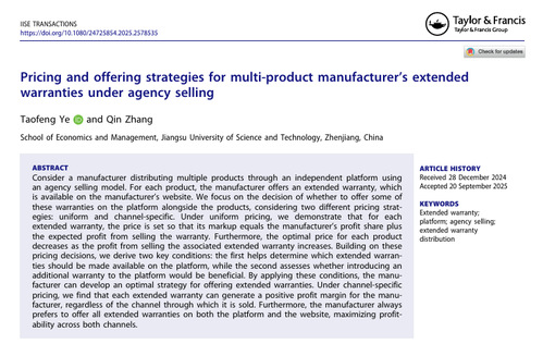 近日,我院叶涛锋教授与博士生章秦合作完成的研究成果“Pricing and offering strategies for multi-product manufacturer’s extended warranties under agency selling”在线发表于工业工程领域权威期刊IISETransactions。该成果为复杂市场环境下制造商的延长保修策略提供了新的理论视角和实践路径。论文链接:https://doi.org/10.1080/24725854.2025.2578535