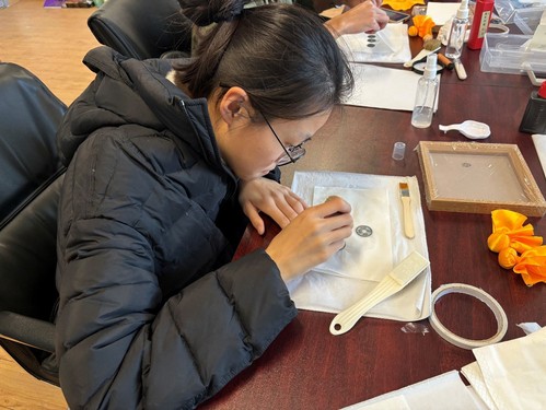 在拓印环节,同学们细心完成铺纸、喷水、敷墨等步骤,亲手拓制出一枚枚古钱币纹样。过程中遇到的墨色晕染、轮廓不清等挑战,也成了锻炼情绪调节与坚持不懈能力的契机。完成的拓片被装裱为“诚信契约”,同学们在背面郑重书写个人承诺或座右铭,以此强化对诚信品质的认同与实践意识。