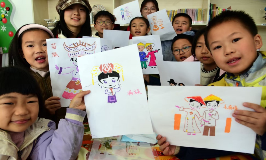 完成创作后,小朋友们争相展示自己的作品,一名小女孩举着绘有苗族头饰的风情画,向志愿者分享创作灵感,喜悦之情溢于言表。这场活动让孩子们在动手实践中解锁了拓印新技能,更在潜移默化中了解了各民族的民俗特色与文化内涵,在心中深化了民族团结的概念。