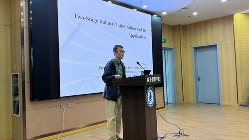 舒嘉教授以《Two-Stage Robust Optimization and Its Applications》为题作学术报告。报告以灾害应急响应阶段的需求信息不对称问题为背景,围绕应急物资入向配送问题,依次构建了确定性模型、两阶段随机模型和两阶段鲁棒优化模型,并提出LP和MIP两种等价求解形式。随后以2010年青海玉树地震为案例,验证了鲁棒模型在应对需求不确定性方面的优越性及MIP形式的计算效率。此外,舒嘉教授还展示了该方法在海运集装箱调度、人道主义救灾物流及汽车零部件供应链等领域的拓展应用,并结合诸葛亮出祁山、巨鹿之战等古代经典战役生动阐释了运筹优化思想的实践内涵,为经管院师生开展相关研究提供了重要思路与有益借鉴。